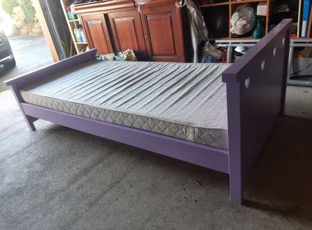 Lit Enfant de 90 très bon état couleur mauve avec sommier et matelas.